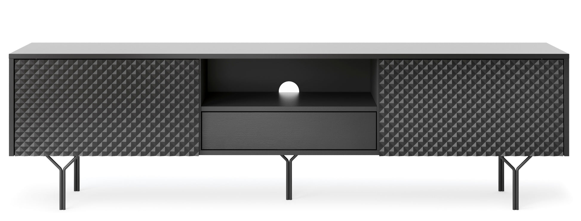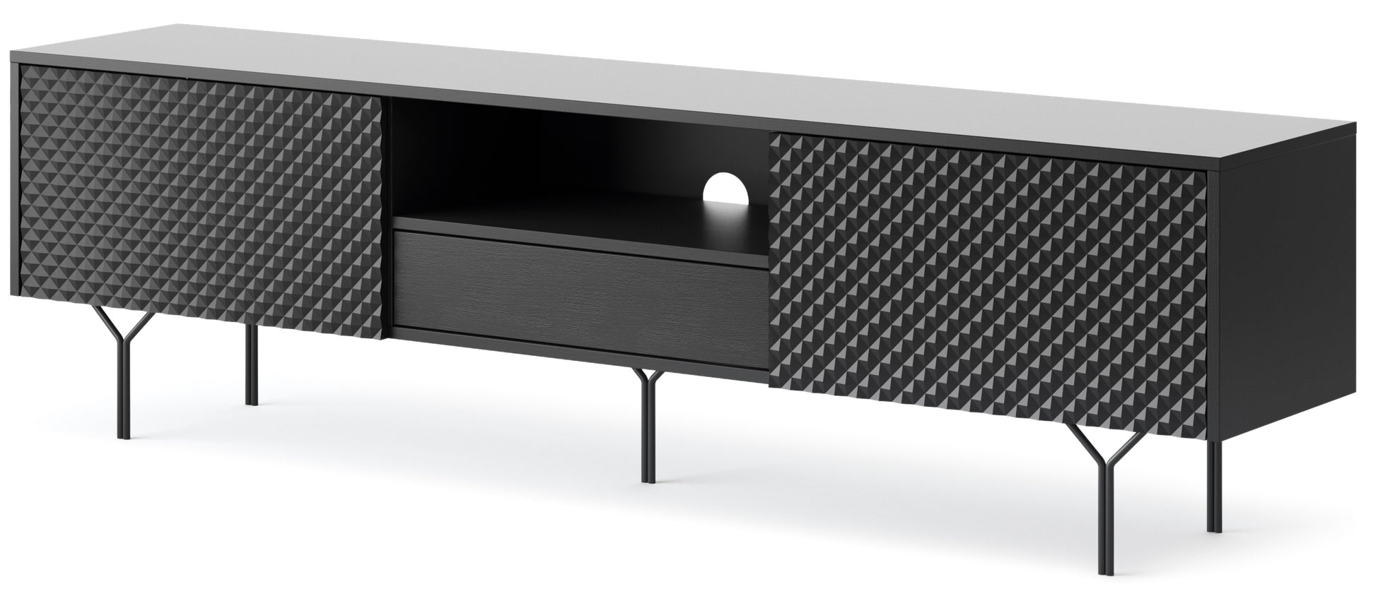 The Raven RTV-180 TV Stand is the perfect addition to any living room. With its sleek black design and elegant appearance, this stand will elevate the look of your media setup. With ample storage space, it provides a practical solution to organize your living room while maintaining an aesthetic appeal.